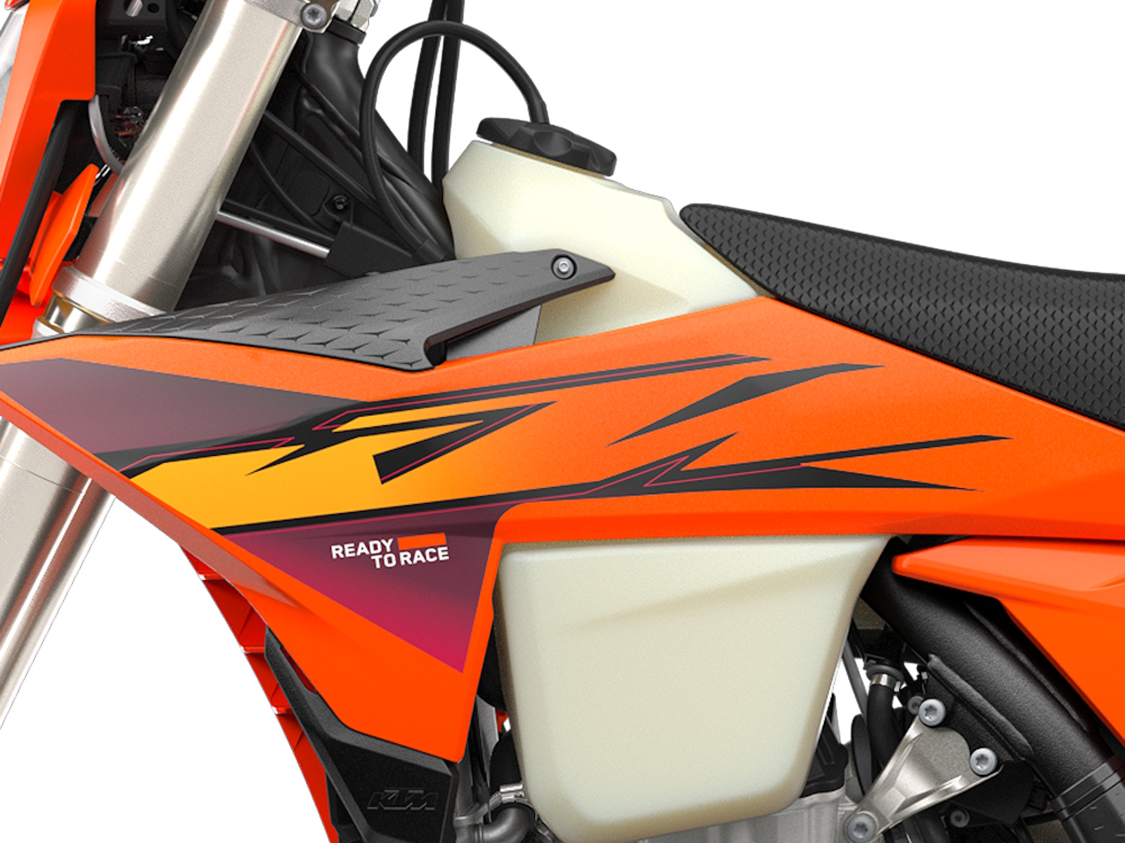 The transparent, polythene (XPE) fuel tank is a signature element of the KTM Enduro lineup. Having undergone thorough race testing in everything from the GNCC to the hardest of FIM hard enduros, these tanks are built, well, like tanks! A one-piece fuel pump and filter manage fuel supply, while servicing is made extra simple with easy fuel filter access. What's more, an updated fuel tank roll now holds the tank more firmly in place and protects the frame against scrubbing.