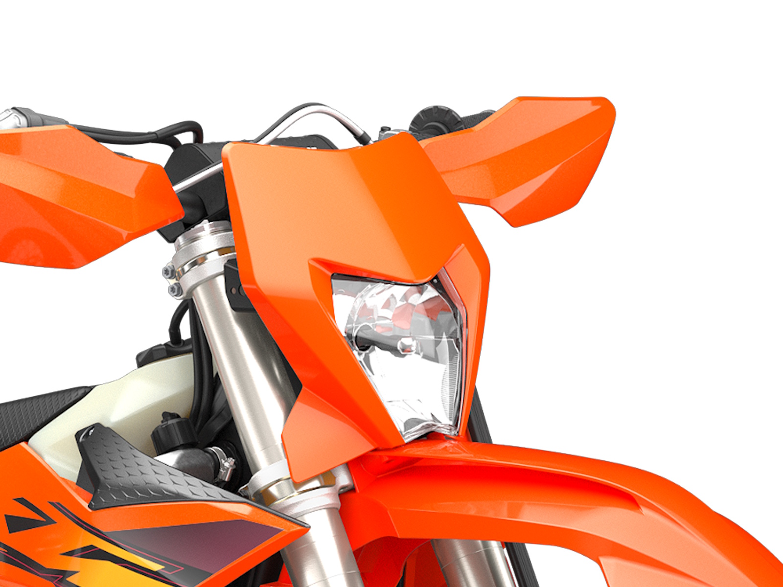 Lighting the way forward, the KTM 450 XCF-W range features an LED headlight unit and light mask. The mask itself features improved triple clamp protection against roost and does away with the rubber mounting straps for improved fitment. Most importantly, the LED lighting unit provides serious illumination, making riding in the dark a completely new experience.