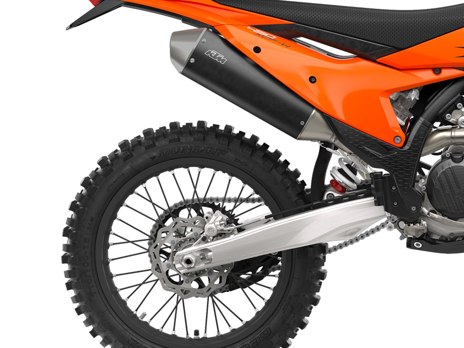 The KTM 450 XCF-W remains rock-solid at any speed thanks to a repositioned and forged steering head connection and CNC-milled triple clamps. Made from high-grade aluminum, these feature optimally tuned steering stem stiffness, perfect alignment of the fork tubes, and precise geometry of the fork clamps to ensure highly responsive and smooth fork action - not to mention unwavering stability for those ultra-fast flat-out special stages.