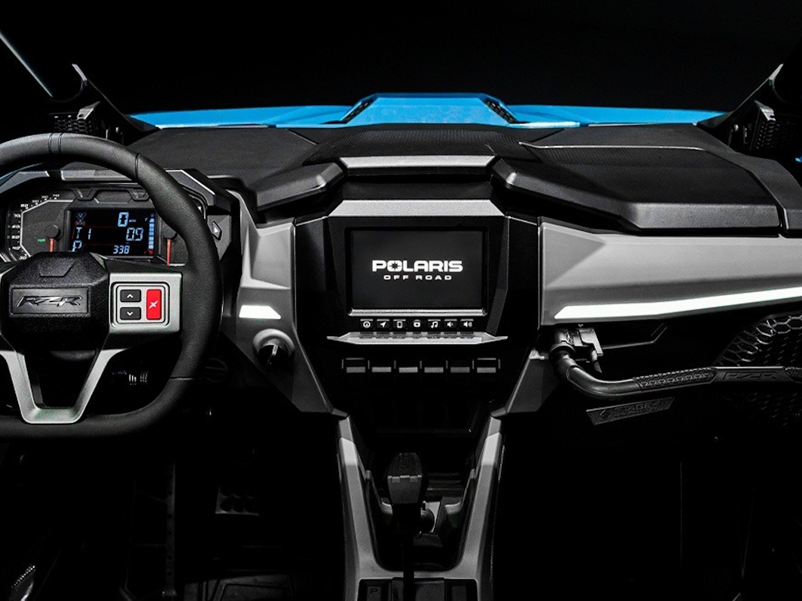 Drive: Driver Forward Information Center with 4 in color display + rotary speedometer & tachometers, programmable service intervals, speedometer, tachometer, odometer, tripmeter, clock, hour meter, gear indicator, fuel gauge, coolant temperature, voltmeter, service indicator and codes, seat belt reminder light, gear indicator, DC outlet, Polaris P.A.S.S anti-theft system