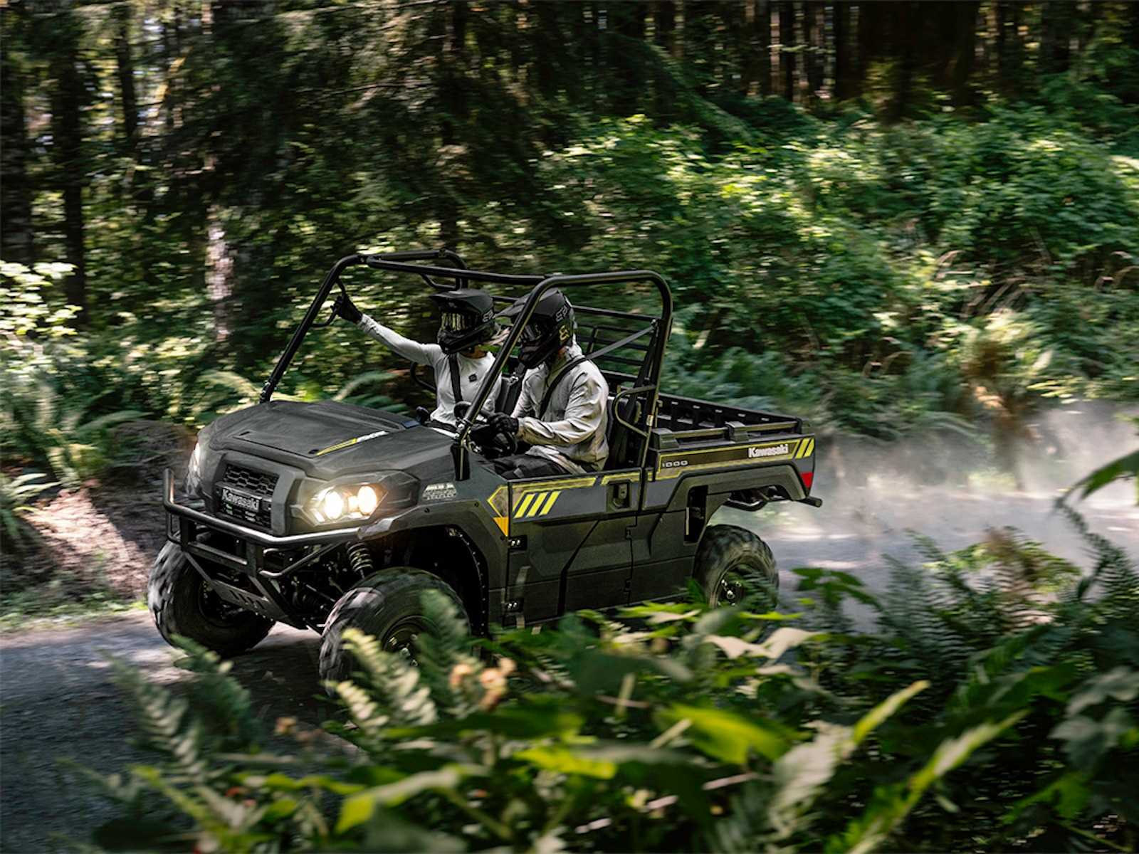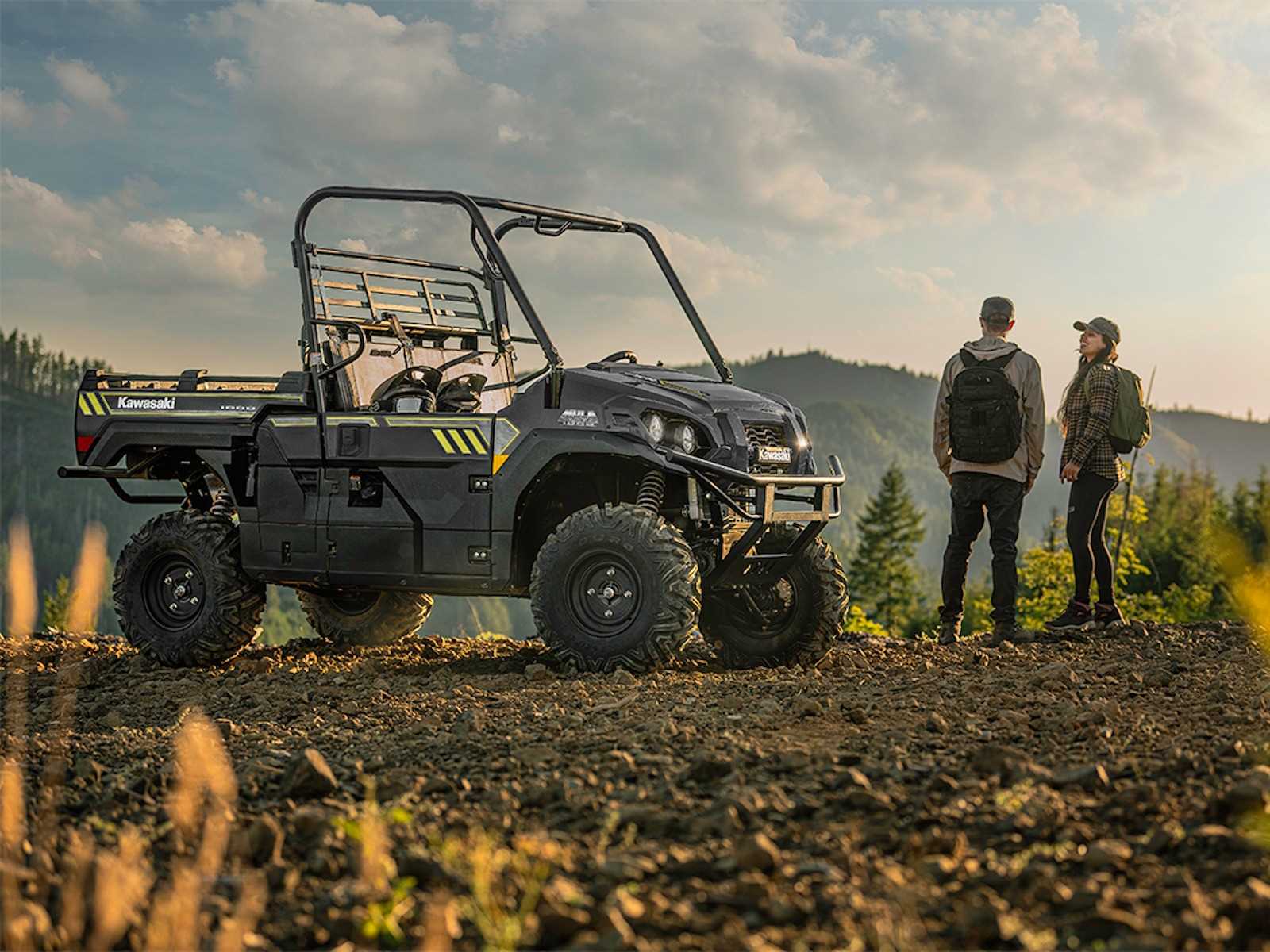 The Kawasaki MULE PRO-FXR™ 1000 side x side takes the rugged capability of MULE™ PRO side x sides to the trails. Turn everyday riding into an unrivaled experience with the combination of comfort, capability, and aggressive styling. With a compact size, high-capacity engine, and 3-passenger seating, the MULE PRO-FXR 1000 is ready to put in the work and then cut loose when the chores are done.