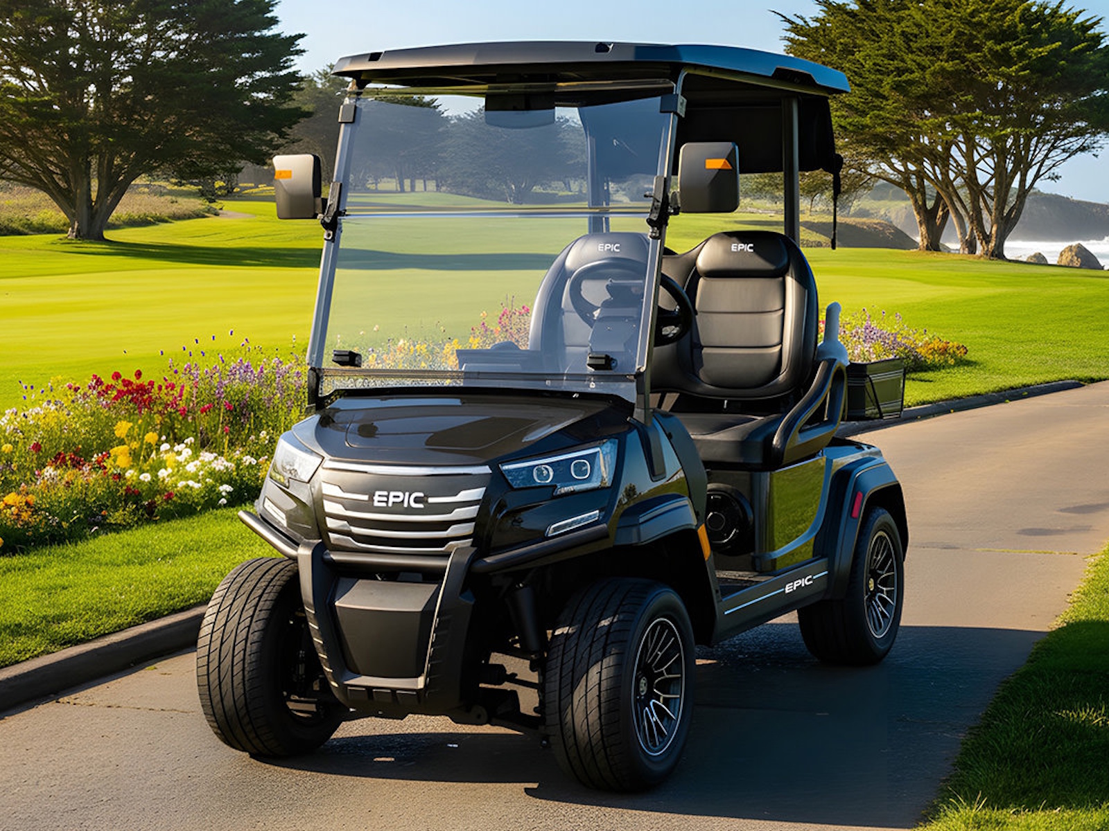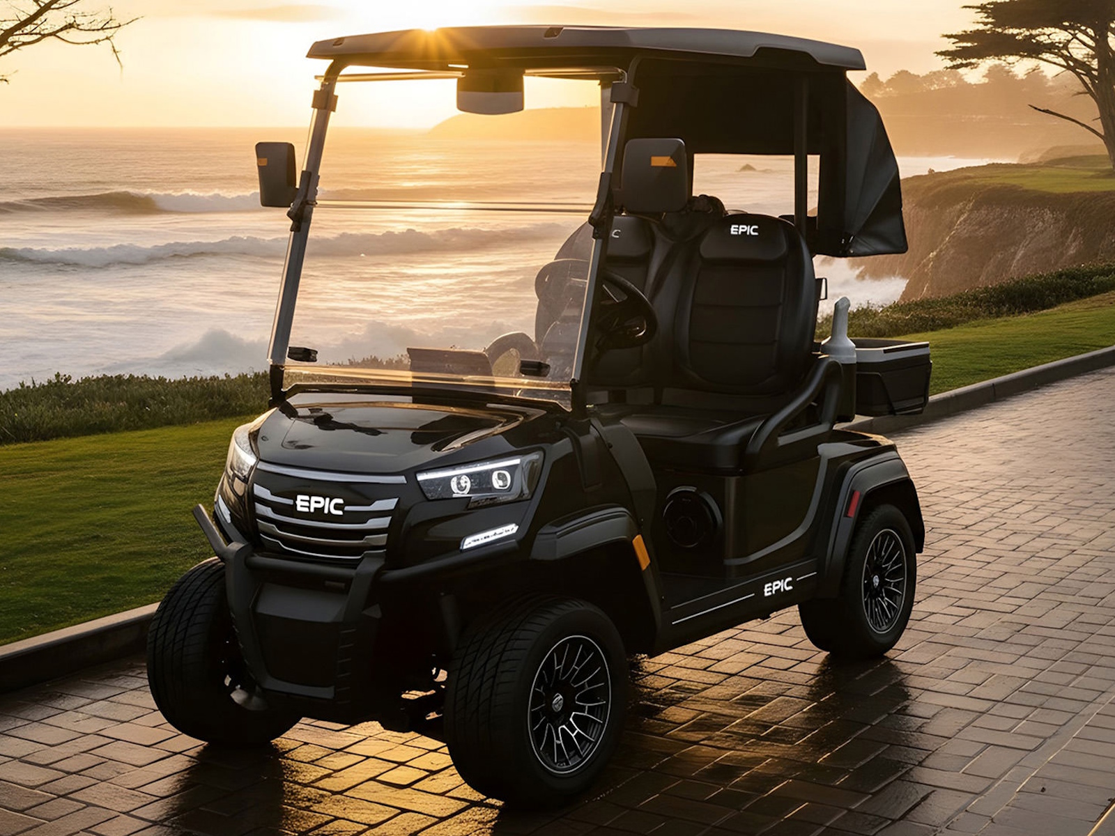 The brand new Epic E20FX golf cart model is creating quite the buzz industry-wide! Furnished with every desirable feature, this two-seater Epic golf cart comes in seven stylish metallic colors. Premium 12” turf friendly tires provide a super smooth and enjoyable ride on and off the golf course. With a top of the line built-in marine-grade sound system, stunning accent lighting, and a rear golf kit with two coolers, two sand bottles, and two golf bag holders, and golf bag rain cover, this Epic E20FX golf cart will make you the envy of every golfer on and off the course!