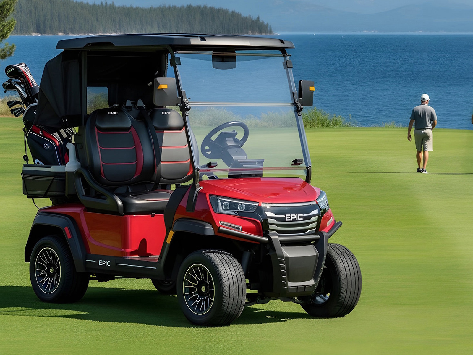 The brand new Epic E20FX golf cart model is creating quite the buzz industry-wide! Furnished with every desirable feature, this two-seater Epic golf cart comes in seven stylish metallic colors. Premium 12” turf friendly tires provide a super smooth and enjoyable ride on and off the golf course. With a top of the line built-in marine-grade sound system, stunning accent lighting, and a rear golf kit with two coolers, two sand bottles, and two golf bag holders, and golf bag rain cover, this Epic E20FX golf cart will make you the envy of every golfer on and off the course!