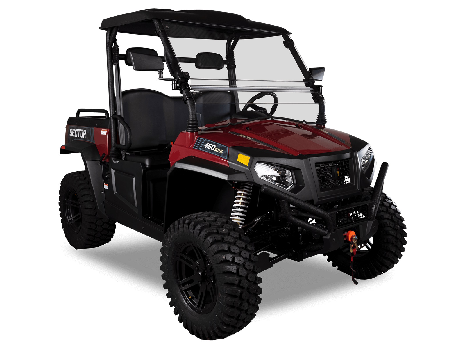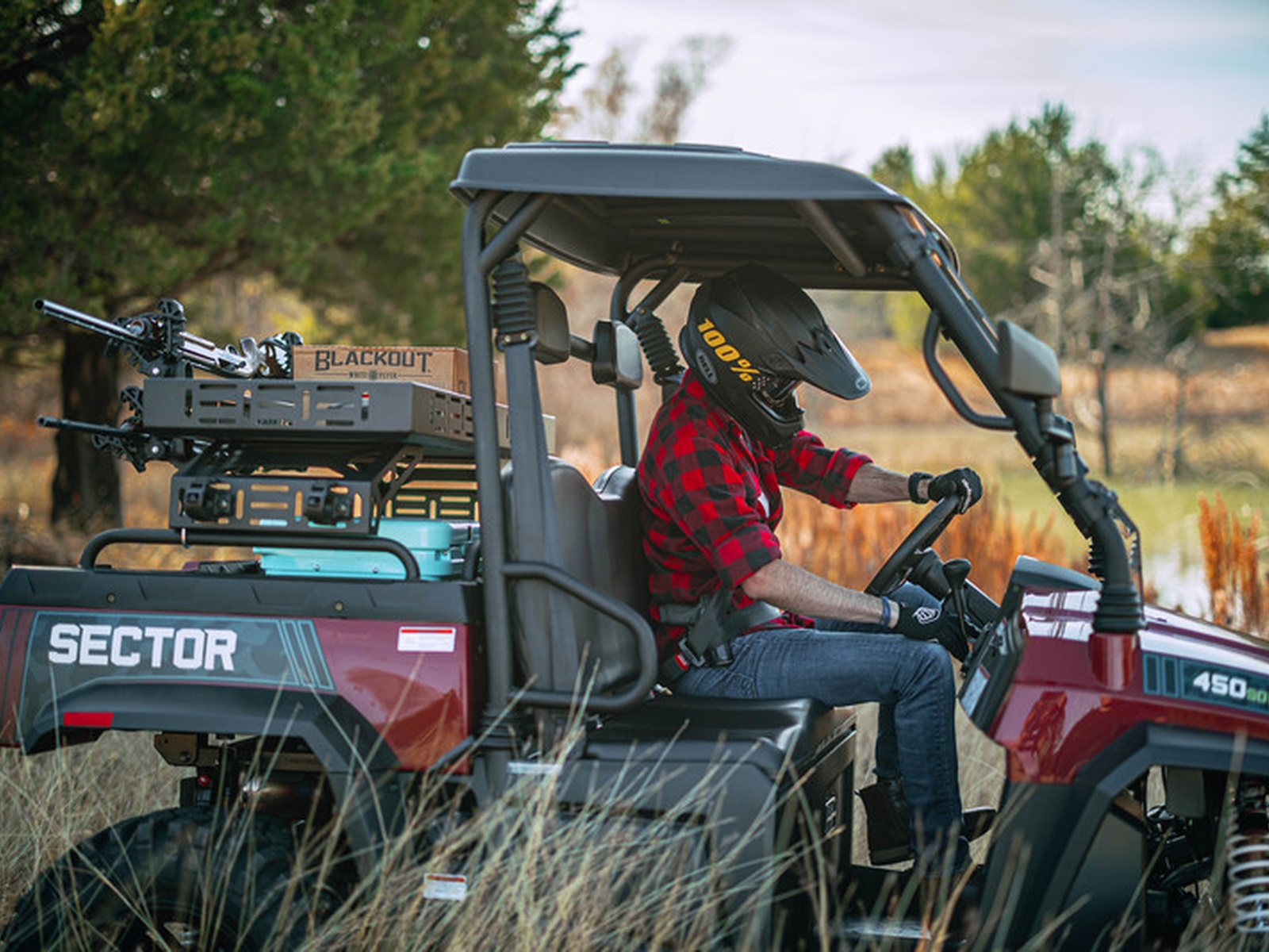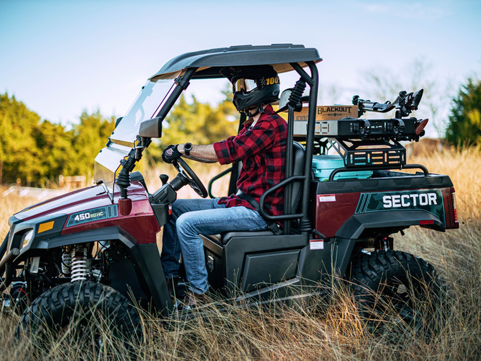 The Sector 450 is the perfect mid-sized UTV with all the features and power of a full-size UTV. Standard with a Roof, Windshield, Side Mirrors, Turn Signals, Winch and aluminum wheels making the Sector 450 the ultimate mid-size Side-X-Side. Packed with a 454cc Single Cylinder EFI Engine with 4-Wheel Drive to help get you to your desired destination. Dual A-Arm Nitrogen Assisted shocks make every arrival smooth.