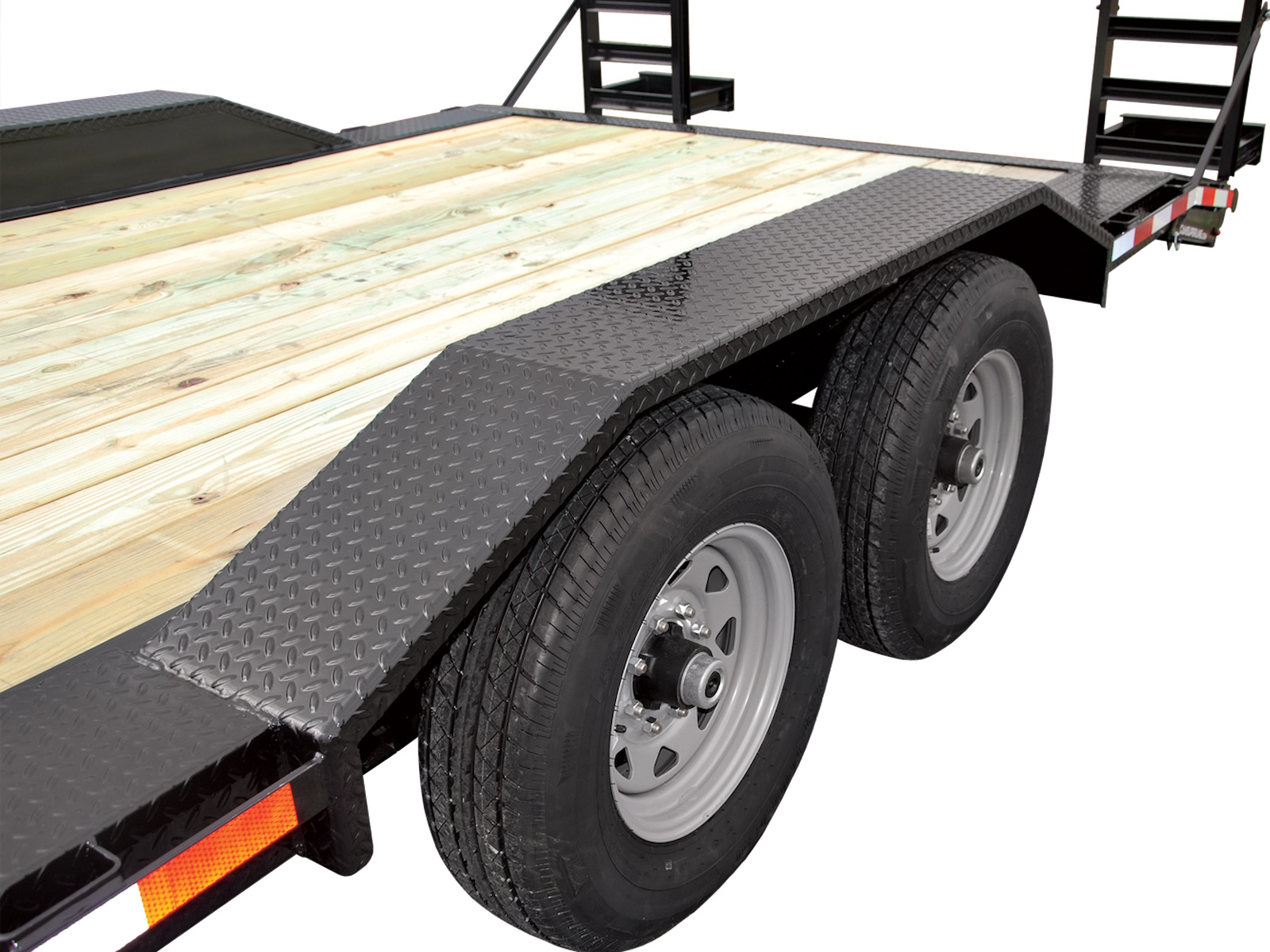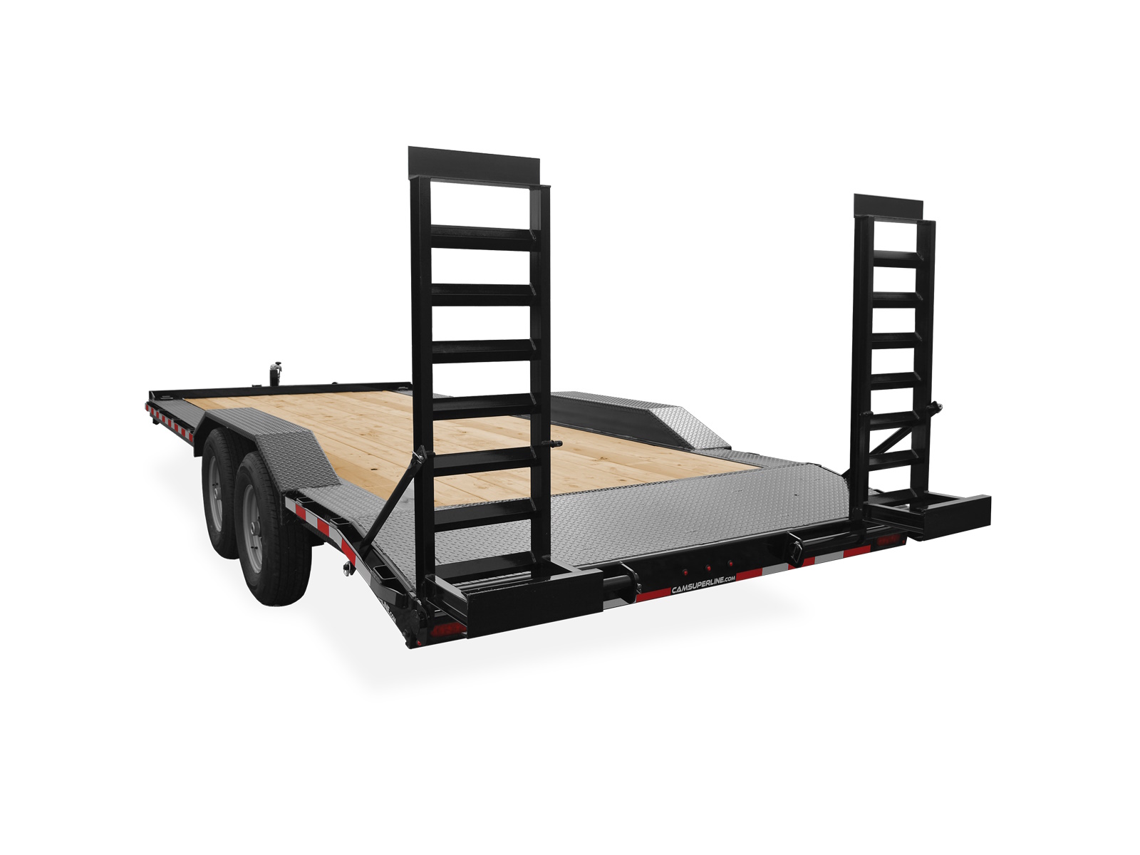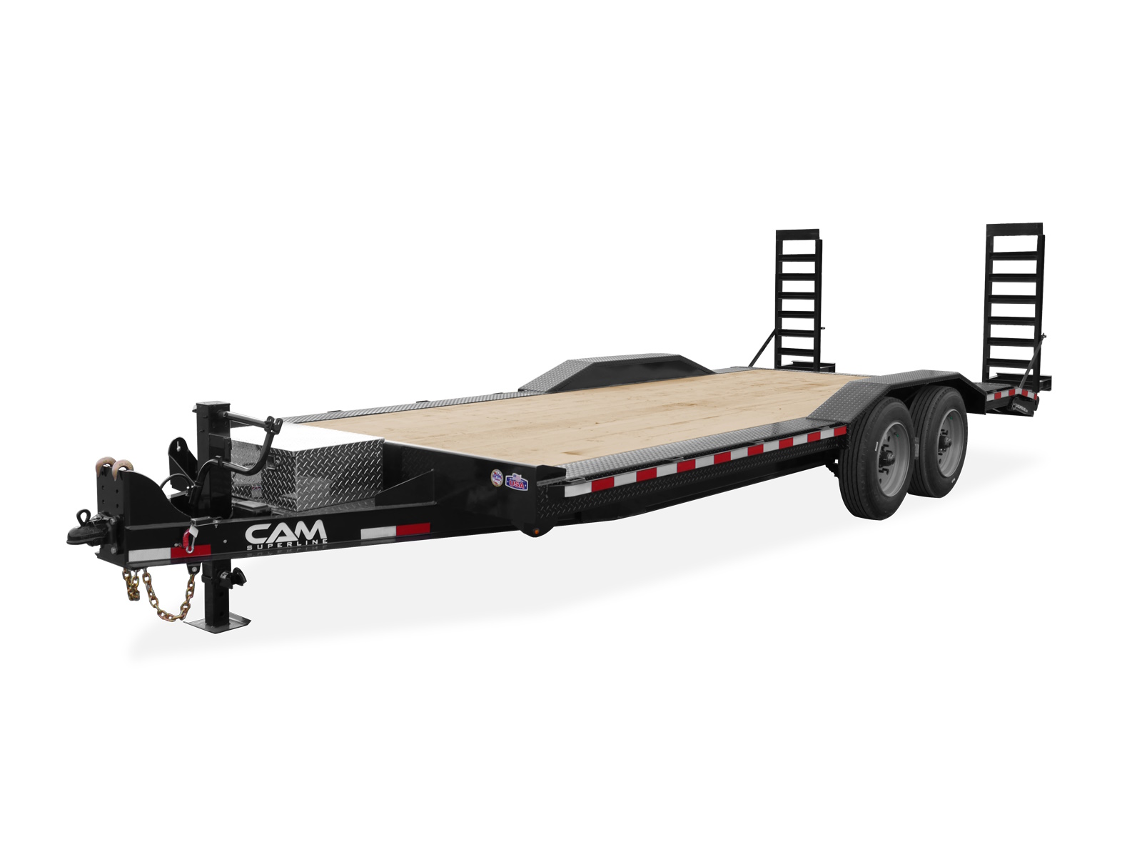 The Full Width Equipment Hauler from CAM Superline® features a 102” wide full-width deck with 3/16” diamond plate steel drive-over fenders, making it the perfect trailer for hauling equipment with a wide wheel base. The 2′ Beavertail in combination with 5′ Quick Release Ramps make loading and unloading safe and easy.