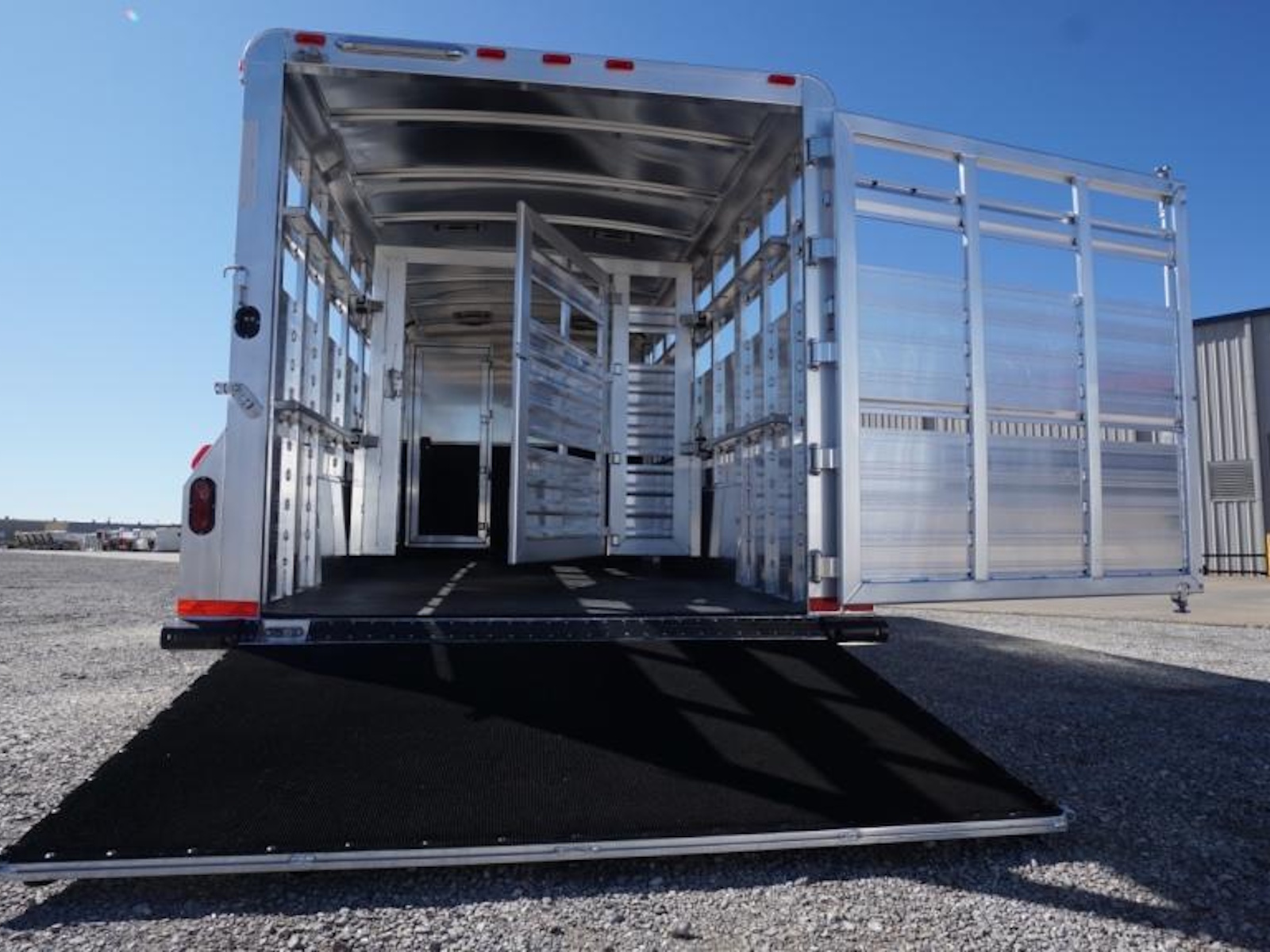 Elite Show Cattle Combo can be configured to meet a wide variety of uses, including small livestock, cattle, and horse transportation, or even a combination of each. The size of the tack room can be customized to fit your needs, and the stock area can be designed with adjustable gate rails and a side ramp for our customers that show cattle, pen systems for those that show small livestock or slant wall, saddle racks, and slant gates for the horse person.