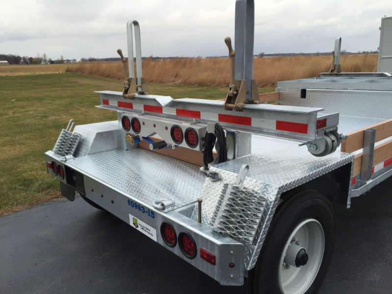 (3) BOA worm gear drive winch binder with stainless steel mandrel and 4″W x 20’L nylon strap with D-ring—5,500 lb. working load limit. Galvanized crank handle w/ on-board storage. Heavy duty hooks installed opposite binders to secure D-ring. Dual binder pipes with PVC surface at I-beam bolsters to maximize pole wrap.